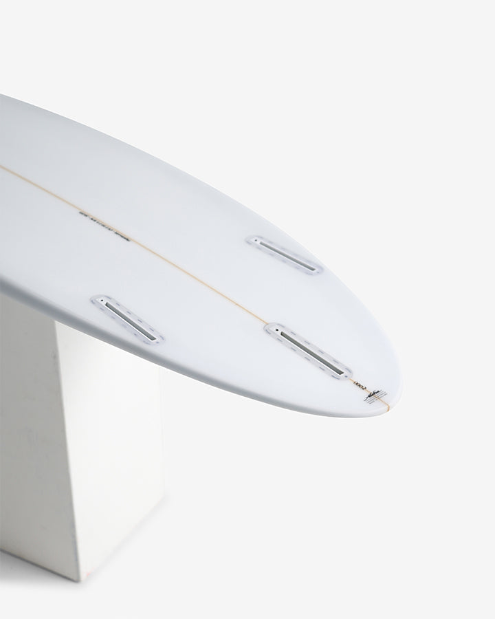 • Rounded pin tail narrows the outline for smooth, sharp turns and a manoeuvrable, shortboard-inspired feel in a mid-length frame